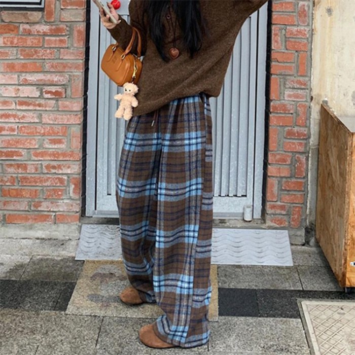 더플로우커머스 여성용 레트로 벨벳 무드 체크 와이드 팬츠