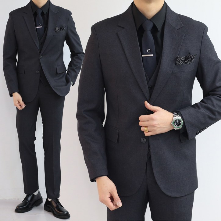 넥타이증정 슬림핏 차콜정장 스판수트 빅사이즈 웨딩촬영 출근룩 면접룩 하객룩 심플정장