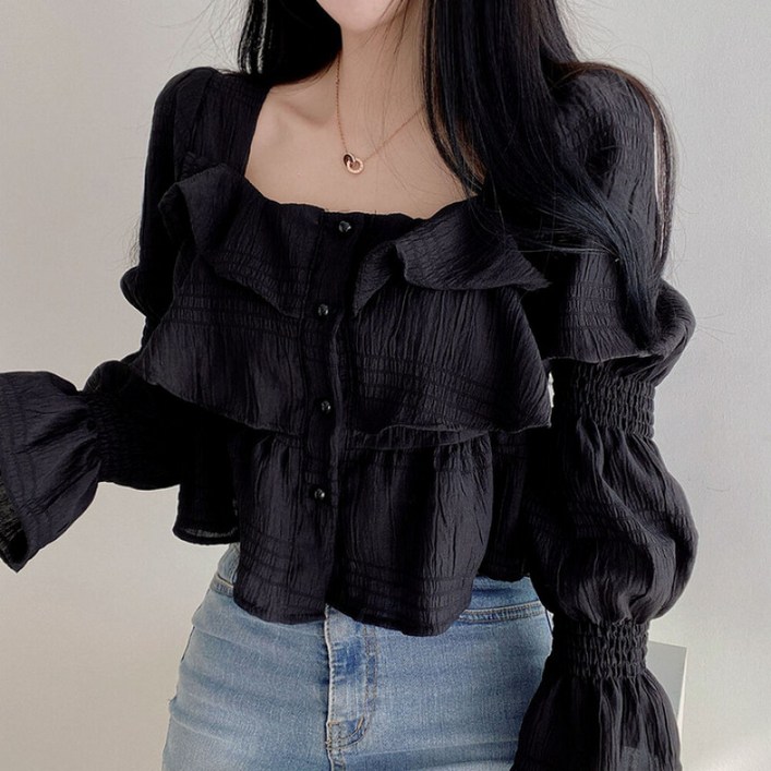 SAHINER 봄여름 여성 로맨틱 스퀘어넥 프릴 긴팔 블라우스 LWACS61