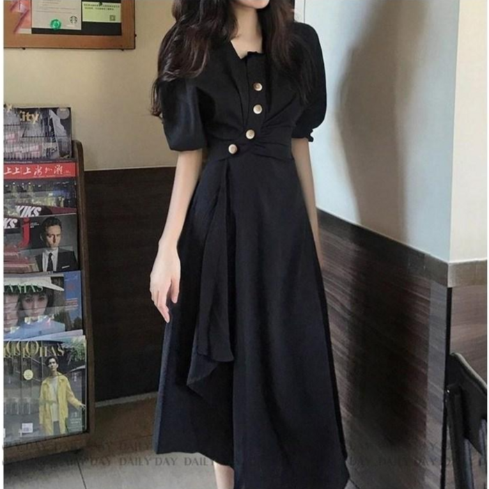 유니크 사선 단추 언발 원피스 여름 퍼프소매 랩 롱 원피스 셔츠원피스