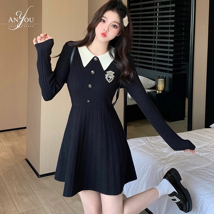 ANYOU 봄 신상 트위드원피스 여성 슬림 니트원피스 브이넥 원피스 쇼트 향풍 스커트