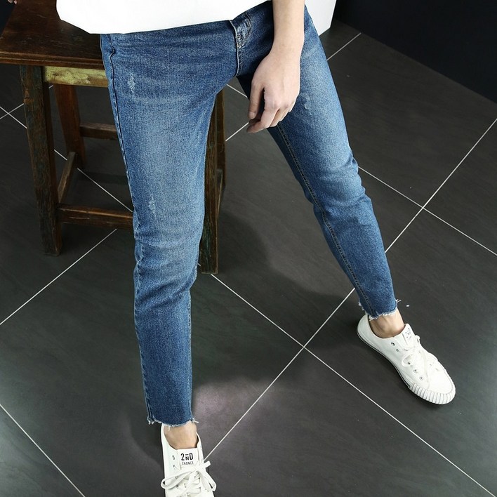 남자 스판 9부 컷팅진 남성 슬림 일자 핏 바지 크롭 데님 팬츠